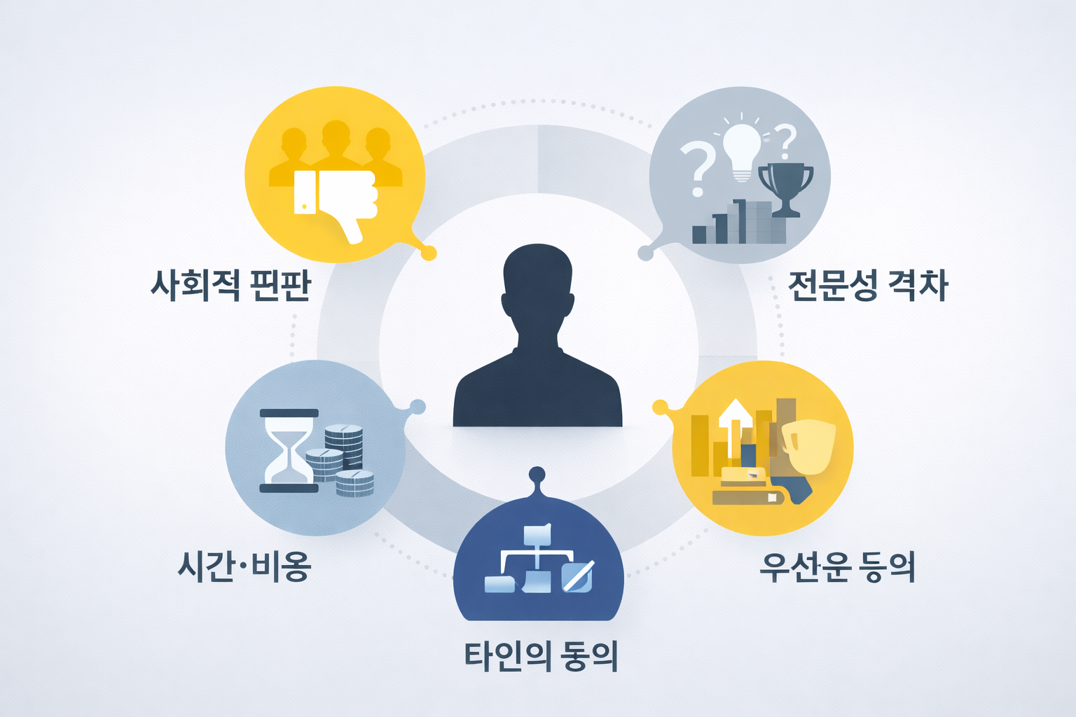 예를 들어 회사 내 평판 리스크, 시간과 비용 부담, 타인의 동의, 다른 소비와의 우선순위 경쟁, 그리고 전문성 부족 등이 구매를 망설이게 만드는 요인이 된다.